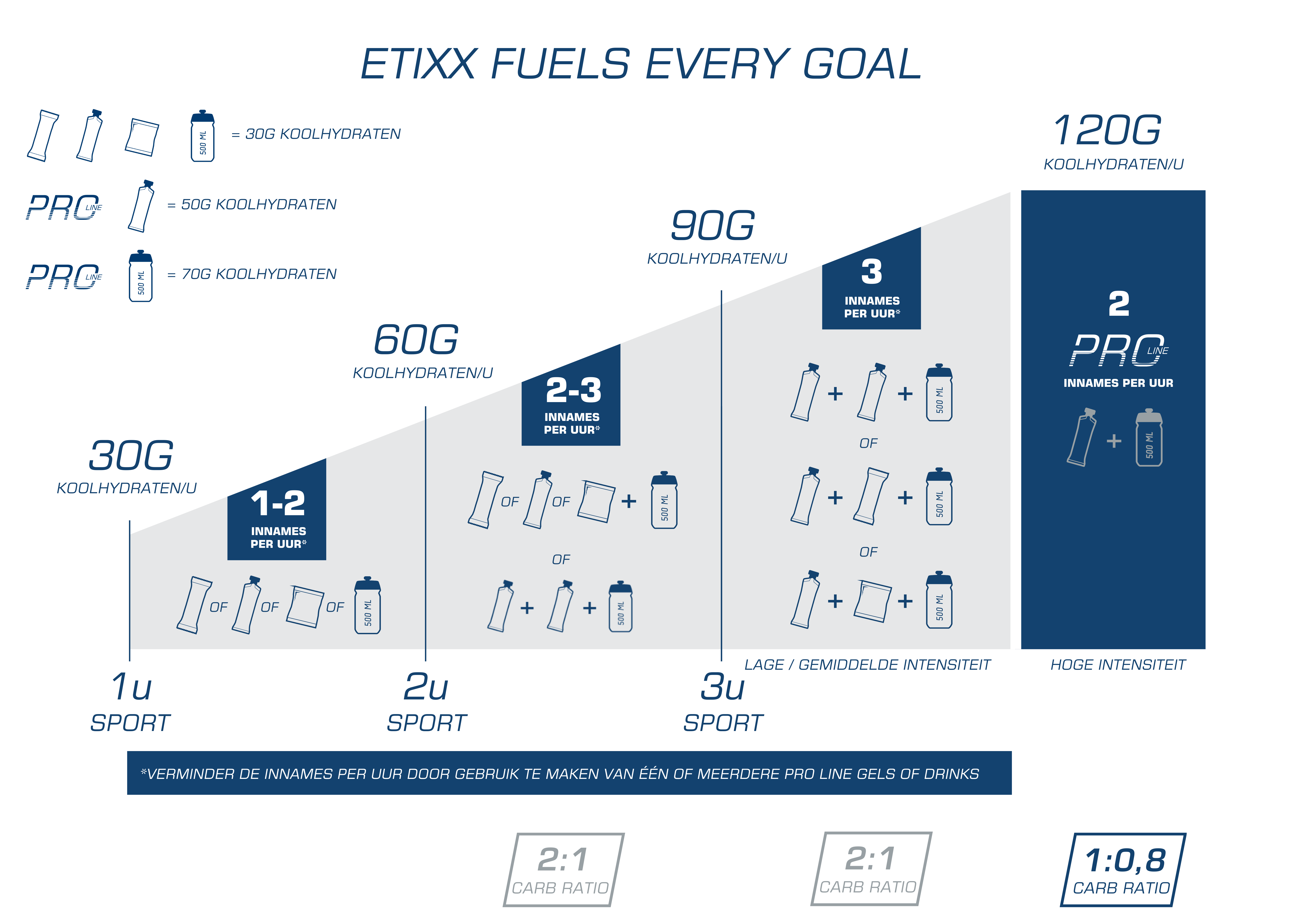 Indien tijdens langdurige inspanningen geen koolhydraten zouden worden ingenomen (via drank, bars, of gels), zouden spierglycogeenreserves uitgeput zijn na ongeveer 90min.